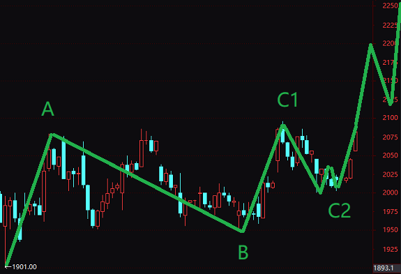 黃金在天圖級別目前是有強勢在支撐的,而4小時級別從2062的高點開始到現在也只不過是個調整,從波浪理論圖解來看,目前所處的位置在短C浪與C浪1之間,如果是短C浪,后面…